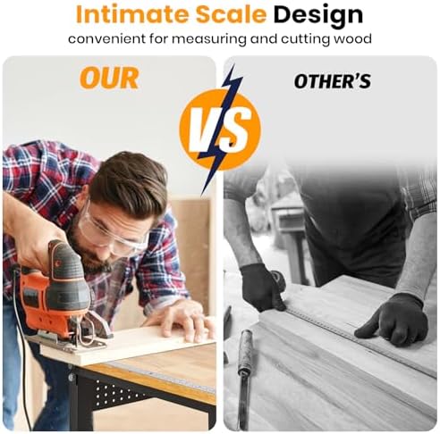 Adapt your workspace perfectly with this 2000-pound capacity bench featuring adjustable legs from 29.5 to 39.4 inches. A pegboard organizes tools, while lockable casters allow easy repositioning. Built-in scales aid precise measurements. The durable rubberwood surface resists wear during intensive use. Suited for offices, garages, or workshops needing flexibility. Sturdy frame ensures safety under heavy loads.